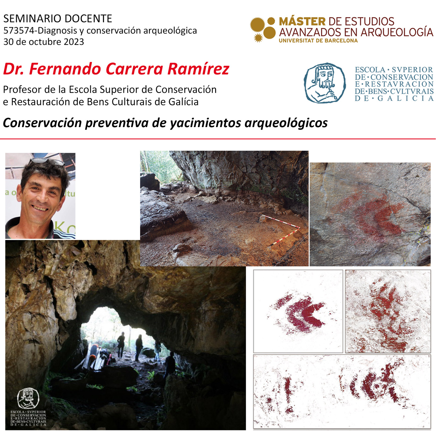 Asignatura 573574-Diagnosis y conservación arqueológica. El pasado 30 de octubre de 2023 tuvo lugar el Seminario Docente: Conservación preventiva de yacimientos arqueológicos a cargo del Dr.Fernando Carrera Ramírez, Profesor de la Escola Superior de Conservación e Restauración de Bens Culturais de Galícia.